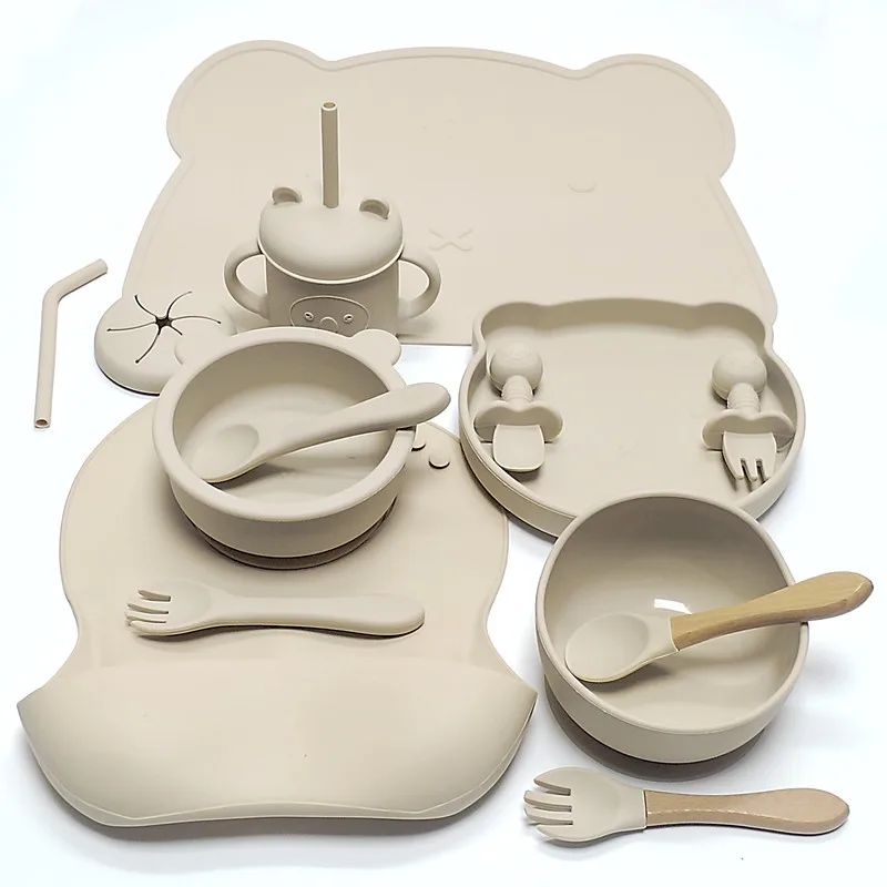 14pcs Silicone Baby Tableware Set Food Children Supplementary Bowl Baby Dinner Plate Fork Spoon Bib Non-slip Bowl Drop-proof Bowl