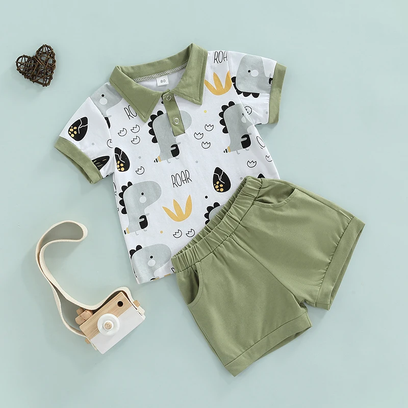 Toddler Kids Boys Casual Suit, Cartoon Dinosaur Printed Short Sleeve Tops+Solid Color Short Pants
