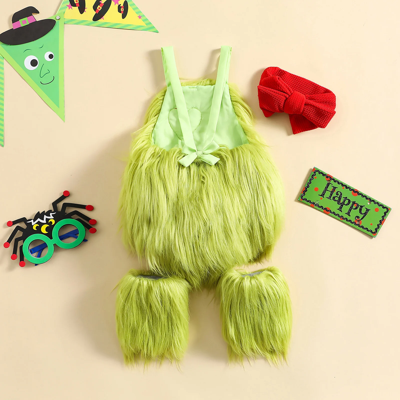 Heart applique halter neck sleeveless plush romper, solid color bowknot headband and leg warmer, simple and cute.