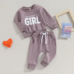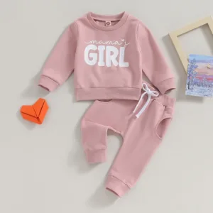 Baby girl outfits, casual letter print sweatshirt and drawstring pants suits, fashionable and comfortable.
