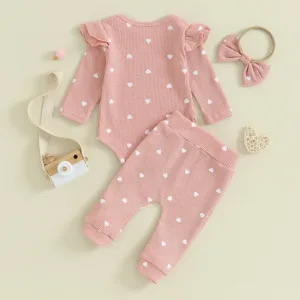 Baby Girls 3Pcs Fall Outfits Long Sleeve Heart Print Romper + Pants + Headband Set Infant Clothes