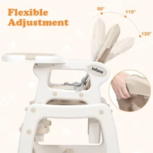 - Adjustable Seat Back & Trays: Our silla de comer para bebe has a user-friendly design that the seat back is adjustable with 3 positions. The 3 lever positions are ideal for baby eating, feeding and relaxing. The distances between the trays to the seat back are also adjustable with 9” to 12” to meet different needs. With such scientific structure, our infant baby highchair can make babies to use more comfortable.