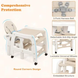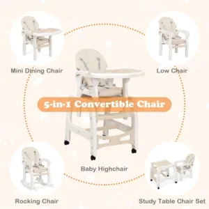 - 5-In -1 Convertible Baby Highchair: highchair for babies and toddlers has a multi-function design that it is not only a highchair, but also can be converted into a rocking chair or table and chair set. And the construction is also very simple to convert it into other forms. The table can be used as sturdy desk or dining table and the chair can be used as a dining chair, a rocking chair or toddler seat. Such high-usage frame makes it available for ages from 6 months to 8 years.