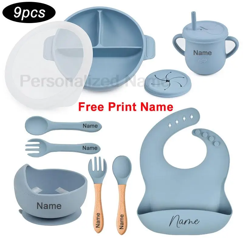 9Pcs Silicone Feeding Bowl For Baby Suction Cup Plate Bib Spoon Fork Cups Kids Tableware Sets Personalized Name BPA Free Free Shipping