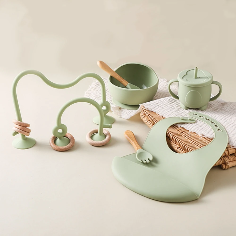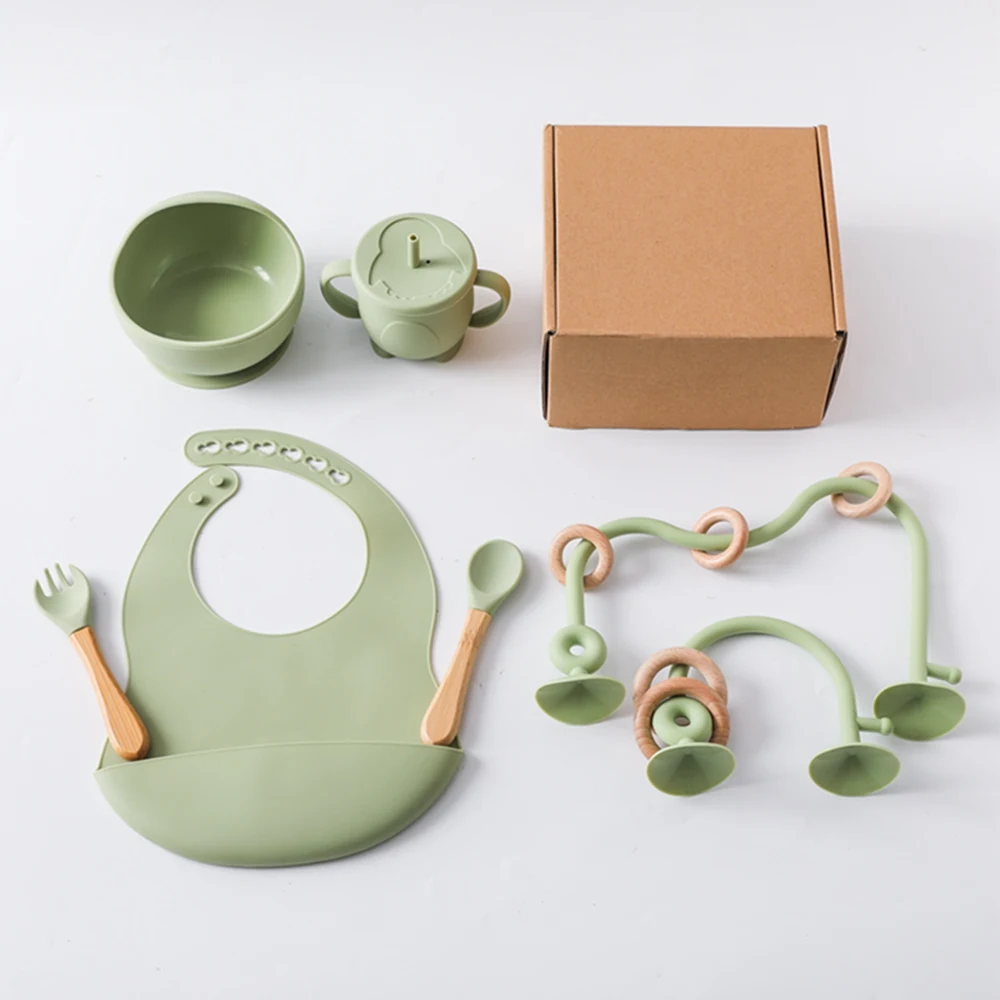 Baby Silicone Tableware Set BPA Free Silicone Non-Slip Feeding Bowl Cup Bibs Wooden Handle Spoon Fork Newborn Feeding Dishes Set