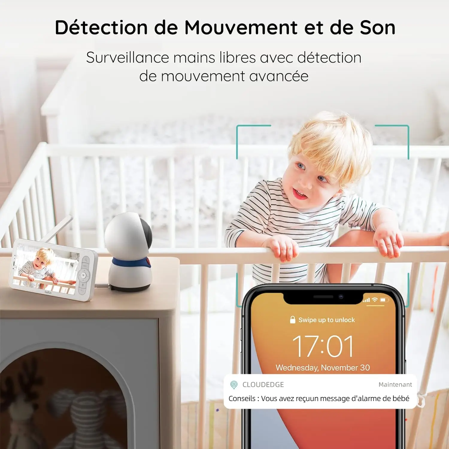 【Motion Detection, Sound Detection and Customisable Alarm Area】This baby surveillance camera supports motion and sound detection. You will be notified when your little one moves or makes noise. You can also customize the designated area in case the baby leaves the area you have set, giving you peace of mind.