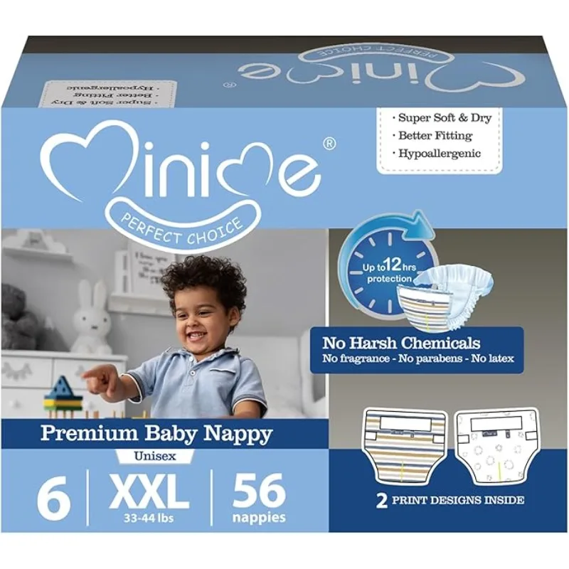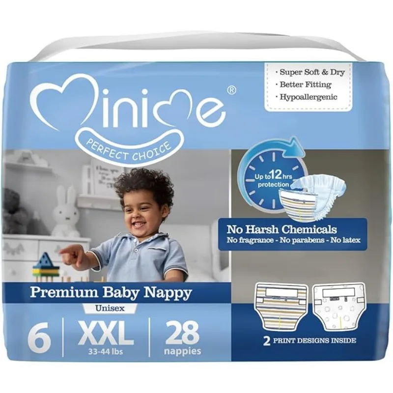 Minime Baby Diapers – Size 6 (33-44 lbs), XX-Large, 28 /56 Count, Premium Ultra Soft Disposable Baby Diapers, Hypoallergenic, Fragrance Free